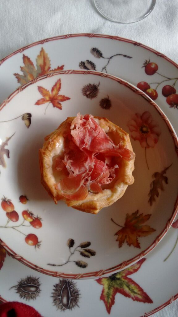 In het bladerdeegbakje kwam een vulling van een romige saus (inmiddels weet ik dat het een kazen pasta saus is), en prei. Afgetopt met wat stukjes seranoham. Dit is écht lekker. En dit ga ik, zonder de ham, zeker eens verwerken bij een vegetarisch hoofdgerecht.
