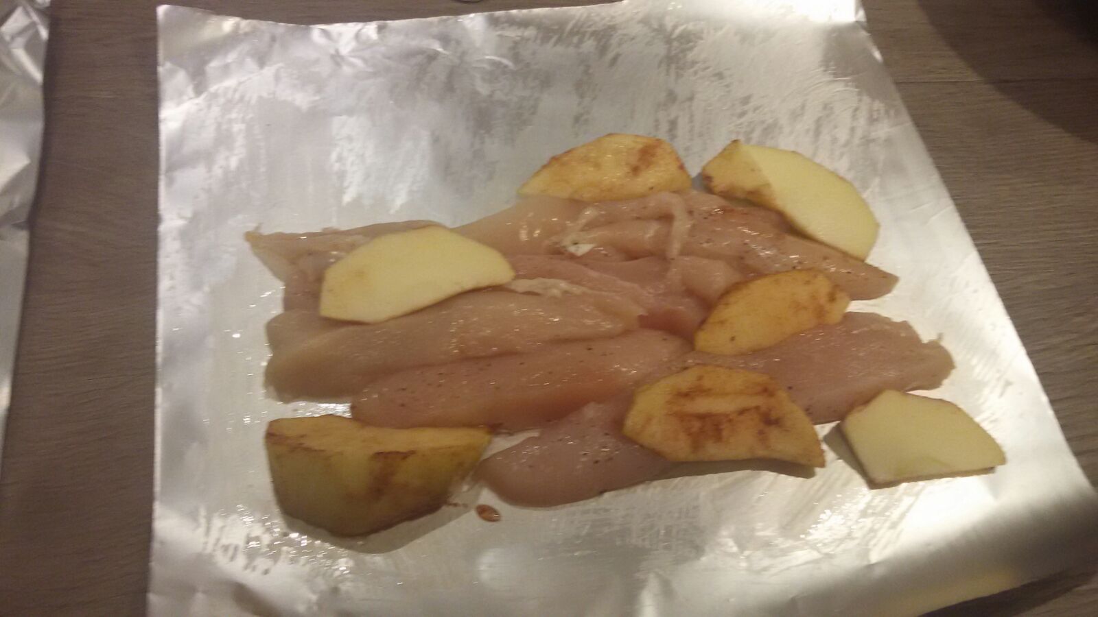 - Snijd de kipfileetjes beiden in repen. Leg op het folie. Snijd de appel in partjes en die partjes ook weer doormidden, dat je kleine schijfjes krijgt.